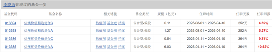 截至2026年4月9日,虽然李晓西在信达澳亚管理的2只基金A\C份额全部飘红,但是管理规模只有管理区区7.96亿元。