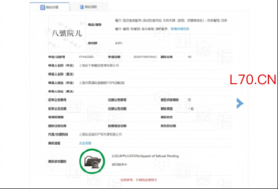 配资炒股从中国商标网查询获悉,皮干猴餐饮于2025年9月申请注册“八號院儿”商标,涉及三个类别,其中国际分类29、35的注册已经于今年3月初审通过,国际分类43的初审被驳回。