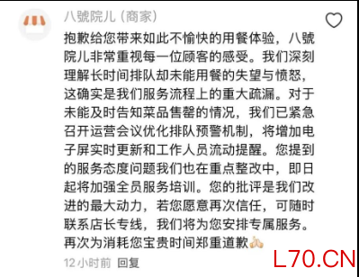 对此,八号院儿商家在App内回复称:“我们深刻理解长时间排队却未能用餐的失望与愤怒,这确实是我们服务流程上的重大疏漏。对于未能及时告知菜品售罄的情况,我们已紧急召开运营会议优化排队预警机制,将增加电子屏实时更新和工作人员流动提醒。”