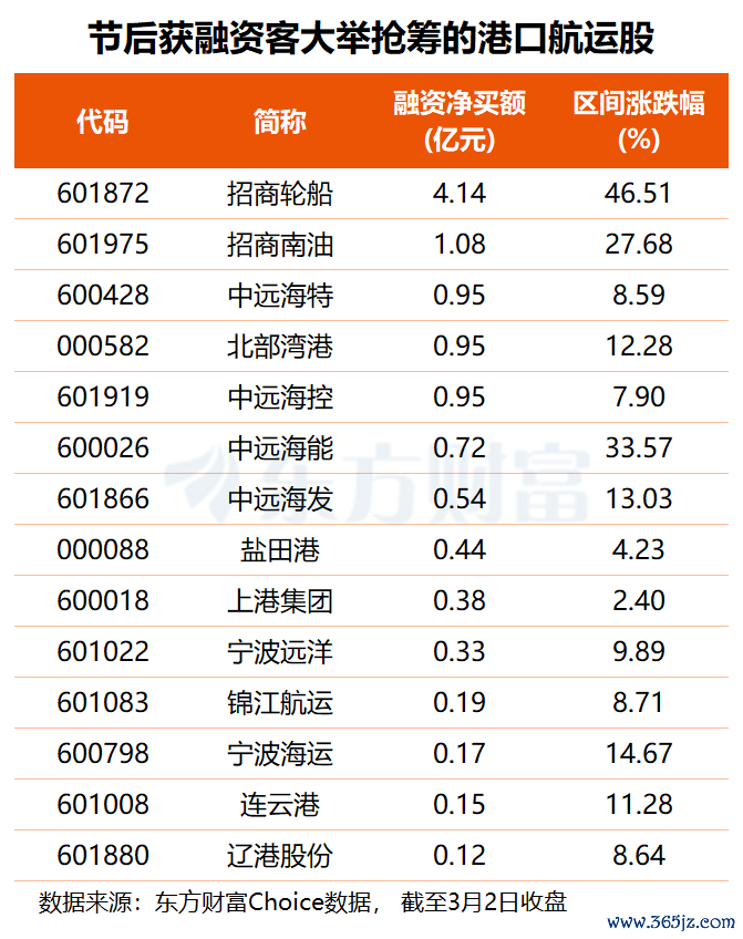 资金方面,东方财富Choice数据显示,节后(2月24日)以来,共有19只港口航运股获得融资净买入,其中,招商轮船、招商南油分别获融资客大举抢筹4.14亿和1.08亿元,中远海特、北部湾港、中远海控均获杠杆资金加仓约0.95亿元,中远海能、中远海发的融资净买额也都在5000万元以上。