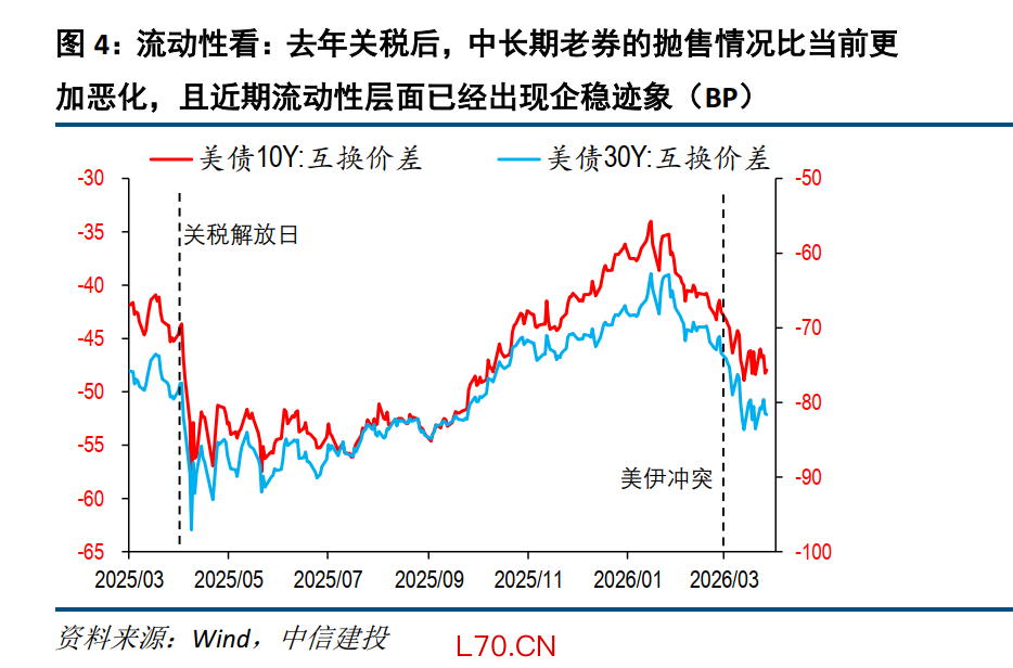 去年关税解放日后,10-30年美债和OIS的互换价差大幅走低,显示市场对相关老券的需求显著恶化,确实存在抛售的情况。