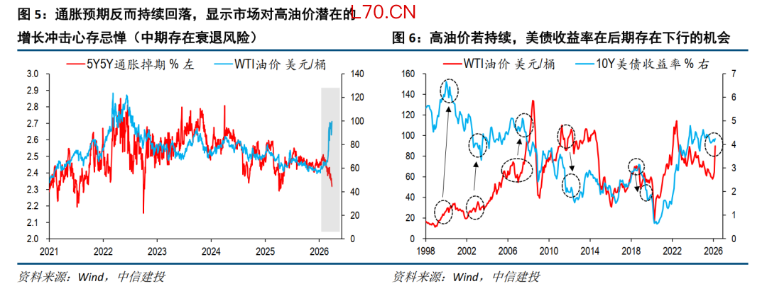 另一个有意思的现象是,去年关税冲击后,油价大跌,通胀预期走低,但今年油价大涨后,掉期市场显示的中长期通胀预期仍保持稳定、甚至逆势下降。这可能意味着,当前地缘和油价的冲击下,短期通胀虽有上行压力,但市场对于中期走势存在较大分歧,甚至倾向于通胀可能走低,背后是衰退风险的上升。