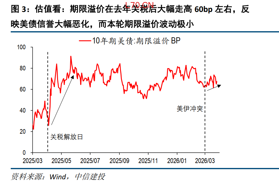 (2)估值冲击:本轮期限溢价上升有限,远低于去年,地缘冲突带来的长期影响幅度或小于去年