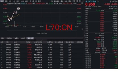 成份股方面,锂电、石化、磷化工等板块部分个股涨幅居前。截至发稿,星源材质飙涨超6%,恒逸石化大涨超4%,新宙邦、圣泉集团、宏达股份等多股涨超3%。