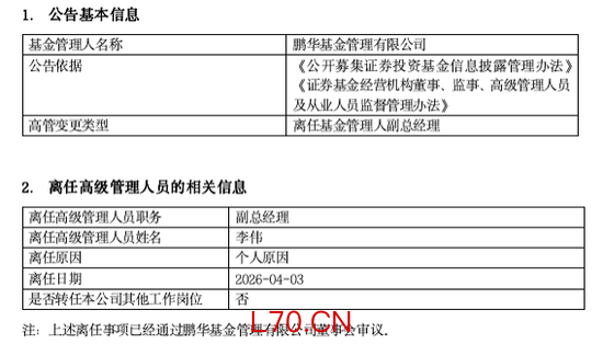 2026年4月4日,鹏华基金管理有限公司发布公告,副总经理李伟因个人原因于4月3日离任,且不再转任本公司其他岗位。