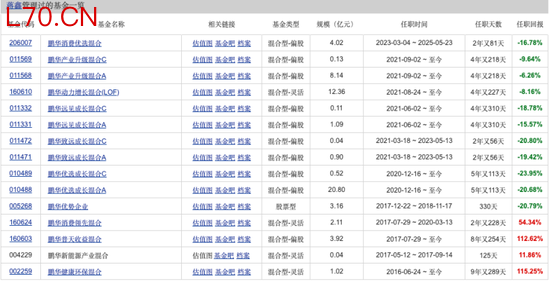 此外,梁浩巅峰管理超400亿元,如今仅剩108.37亿元,在管基金8只基金中,有5只基金任期回报为负,其中规模最大的一支鹏华汇智优选混合A,截止2026年4月规模为34.56亿元,梁浩任职超过5年,任期回报为-25.71%。